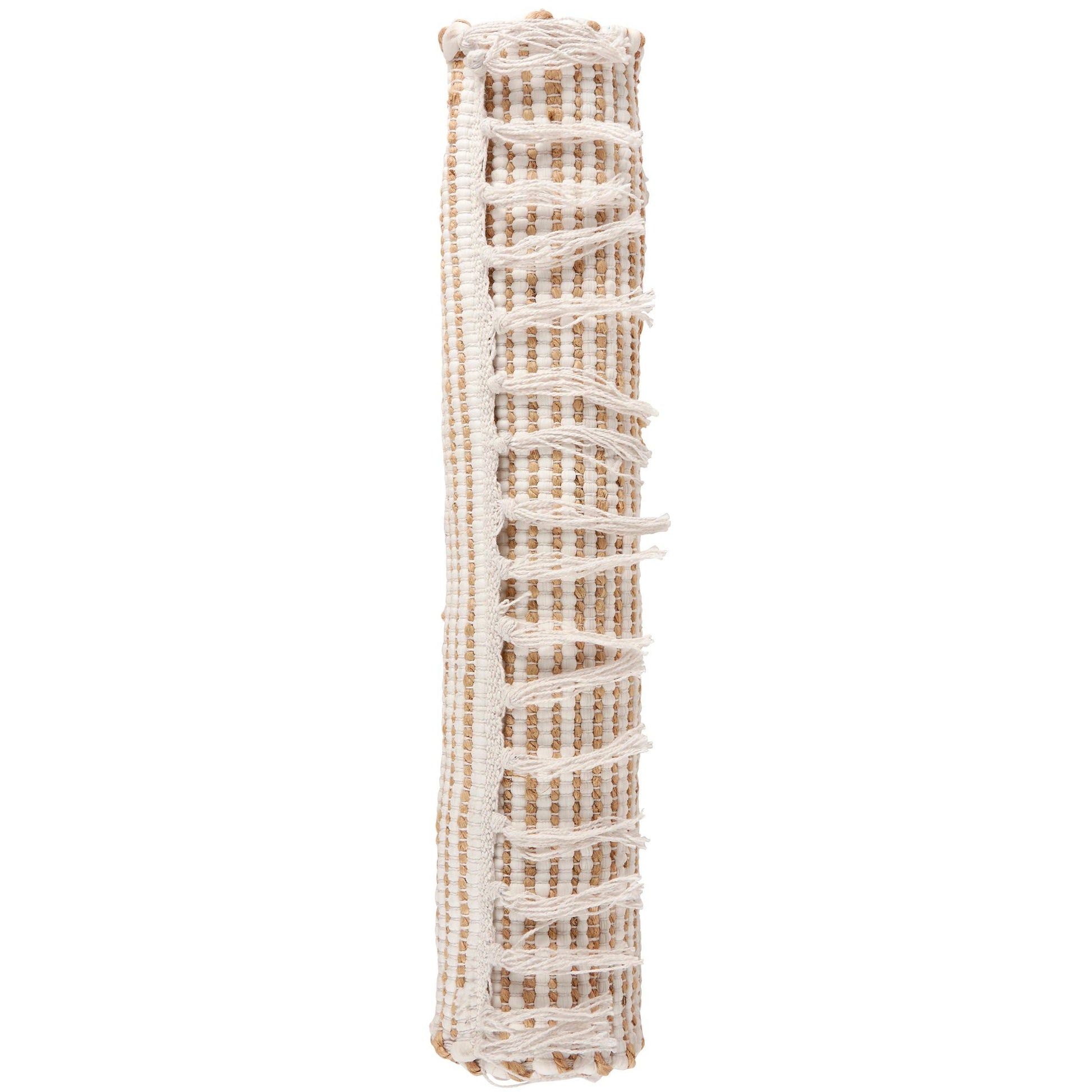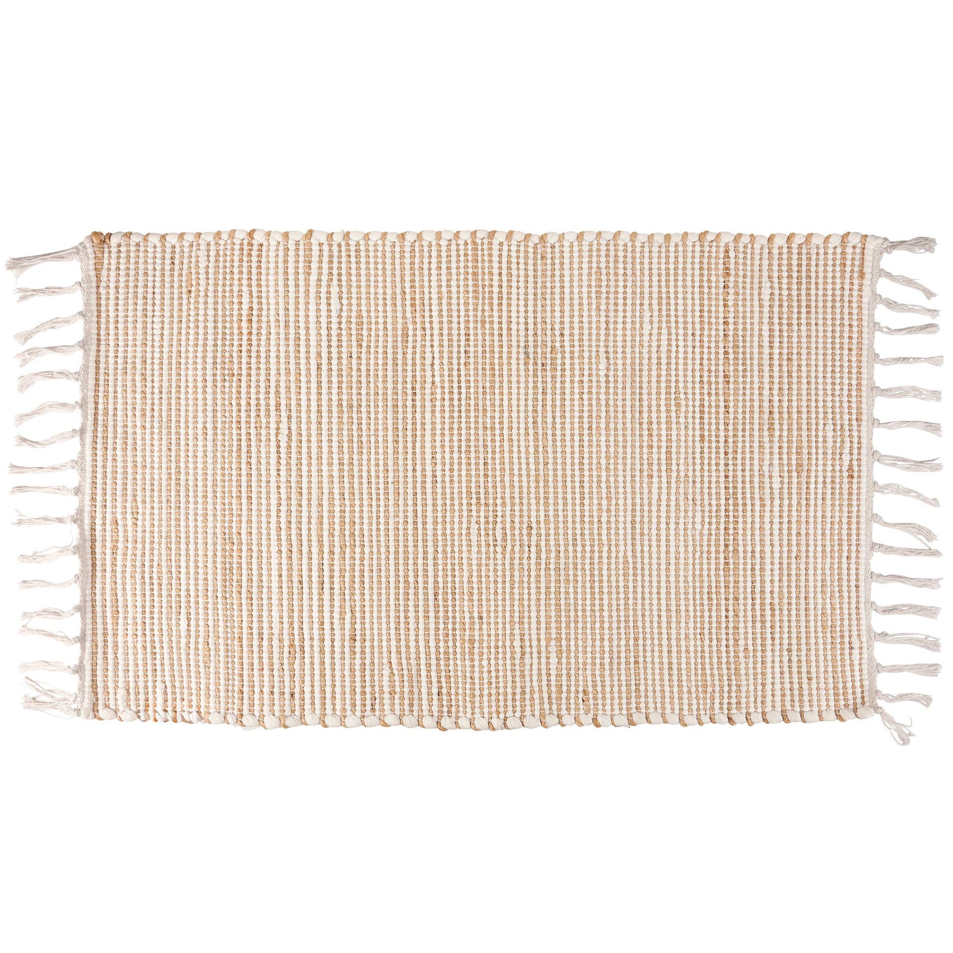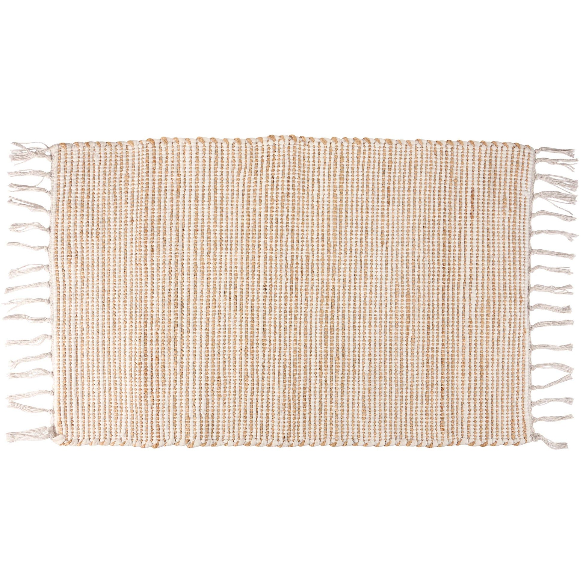 A cotton rug from our Home Collection displaying a neutral cream and brown woven design with tassels on the sides. Woven rug can be used indoor or covered outdoor and features skid-resistant backing to help stay in place. Spot cleaning recommended. Our Cream Woven rug comes packaged neatly rolled with hangtag. A neutral home accent that coordinates with a variety of home decor.