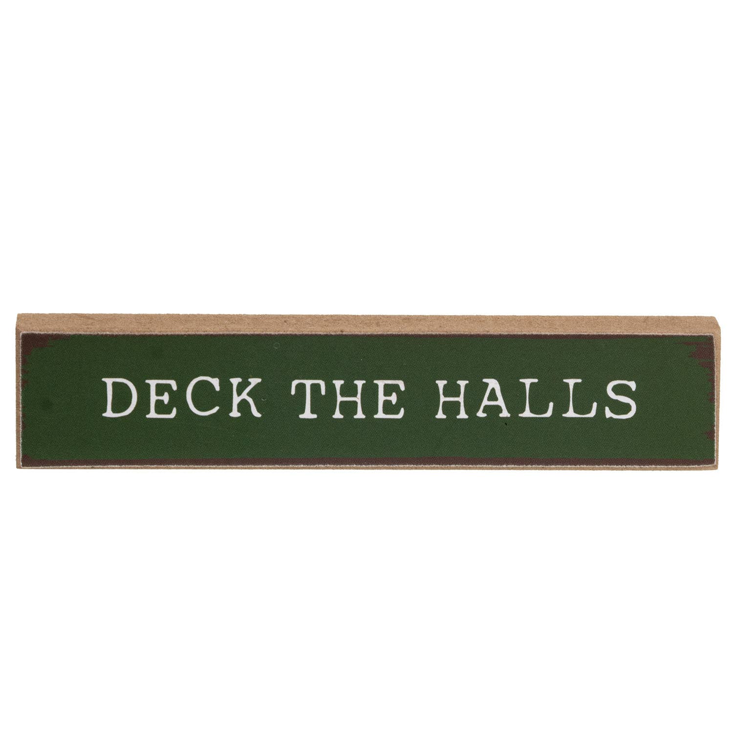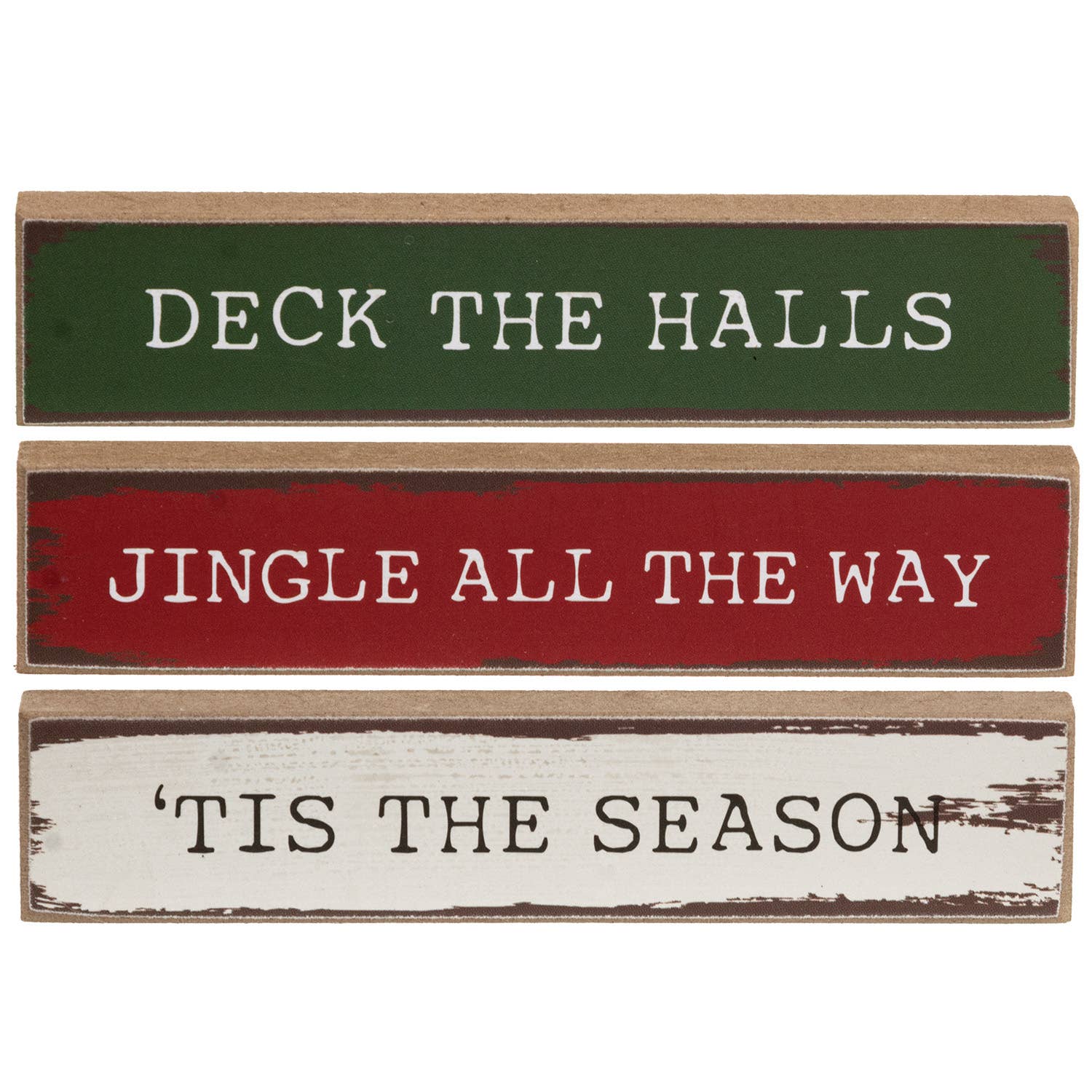 Comes as a set! These 3 assorted mini sticks have a vintage look and read either, "deck the halls," "jingle all the way," or "'tis the season." The stackable wooden blocks are perfect for accenting a winter collection of classic farmhouse Christmas decor. The sides are unpainted and the edges are distressed. Measures 1" high by 6" wide by 0.5" deep.
