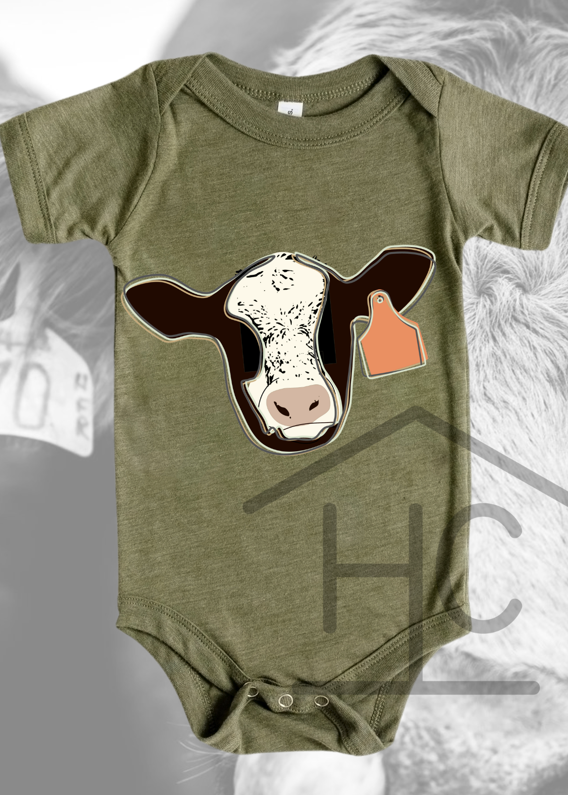 Our Tagged Calf bodysuit is a charming addition to any little one's wardrobe. Crafted in a beautiful Bella Canvas Olive Green Triblend, this bodysuit offers a cozy and stylish look for your baby. As a brand, we stand for all things agriculture, cattle, and God, and our designs reflect these passions. Each piece is handmade in-house, from designing to printing, ensuring a unique and heartfelt touch in every item.